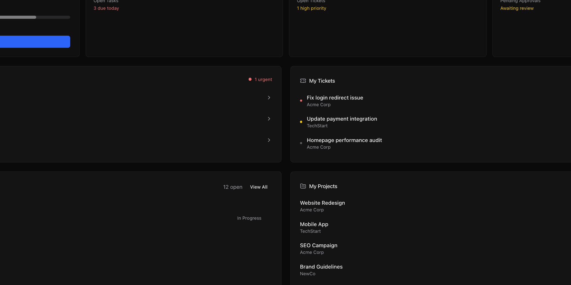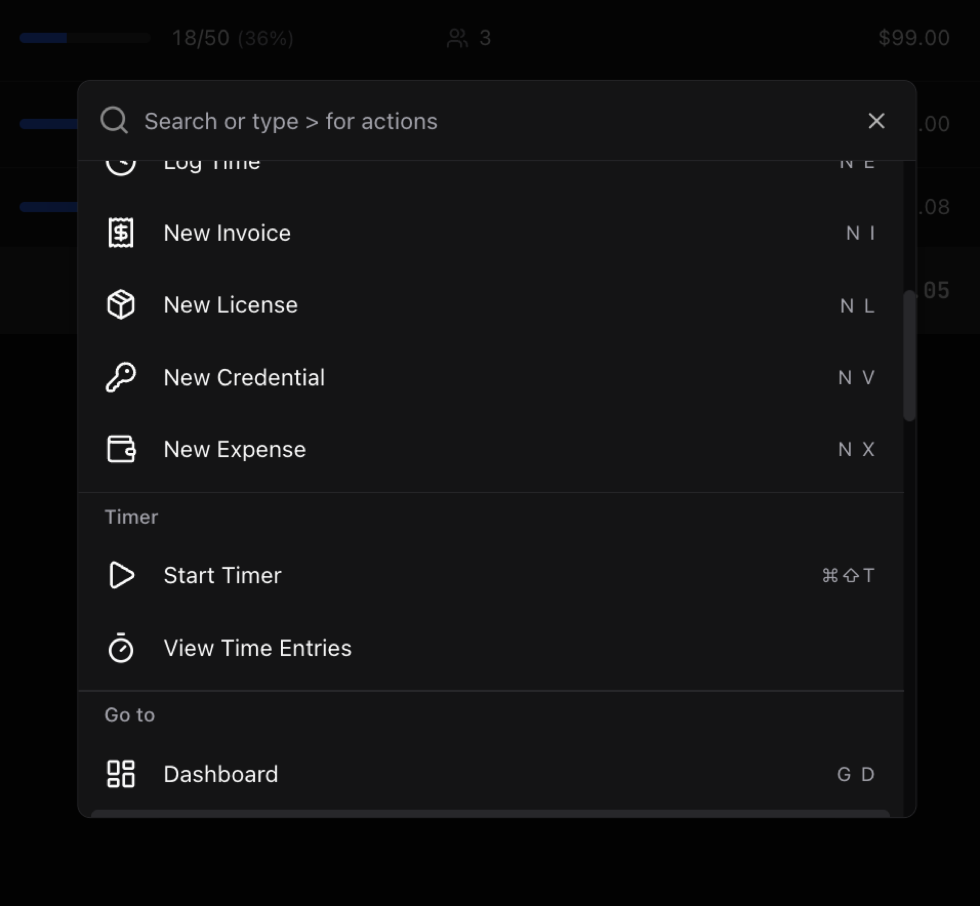 Hit Cmd+K from anywhere. Type what you want. Jump to any client, invoice, project, or ticket in under 3 seconds. Once you use it, you can't go back.