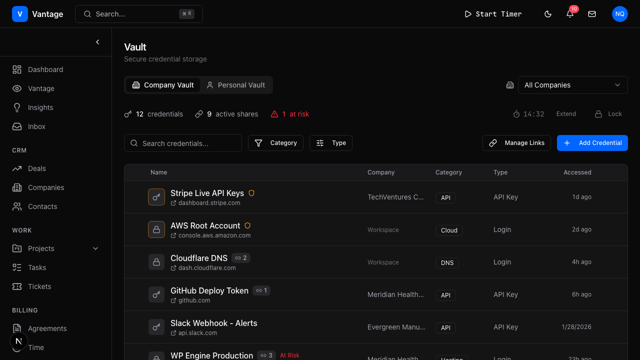 Vantage has a zero-knowledge credential vault with military-grade encryption. Every access is logged. You can grant and revoke access per credential, per team member.