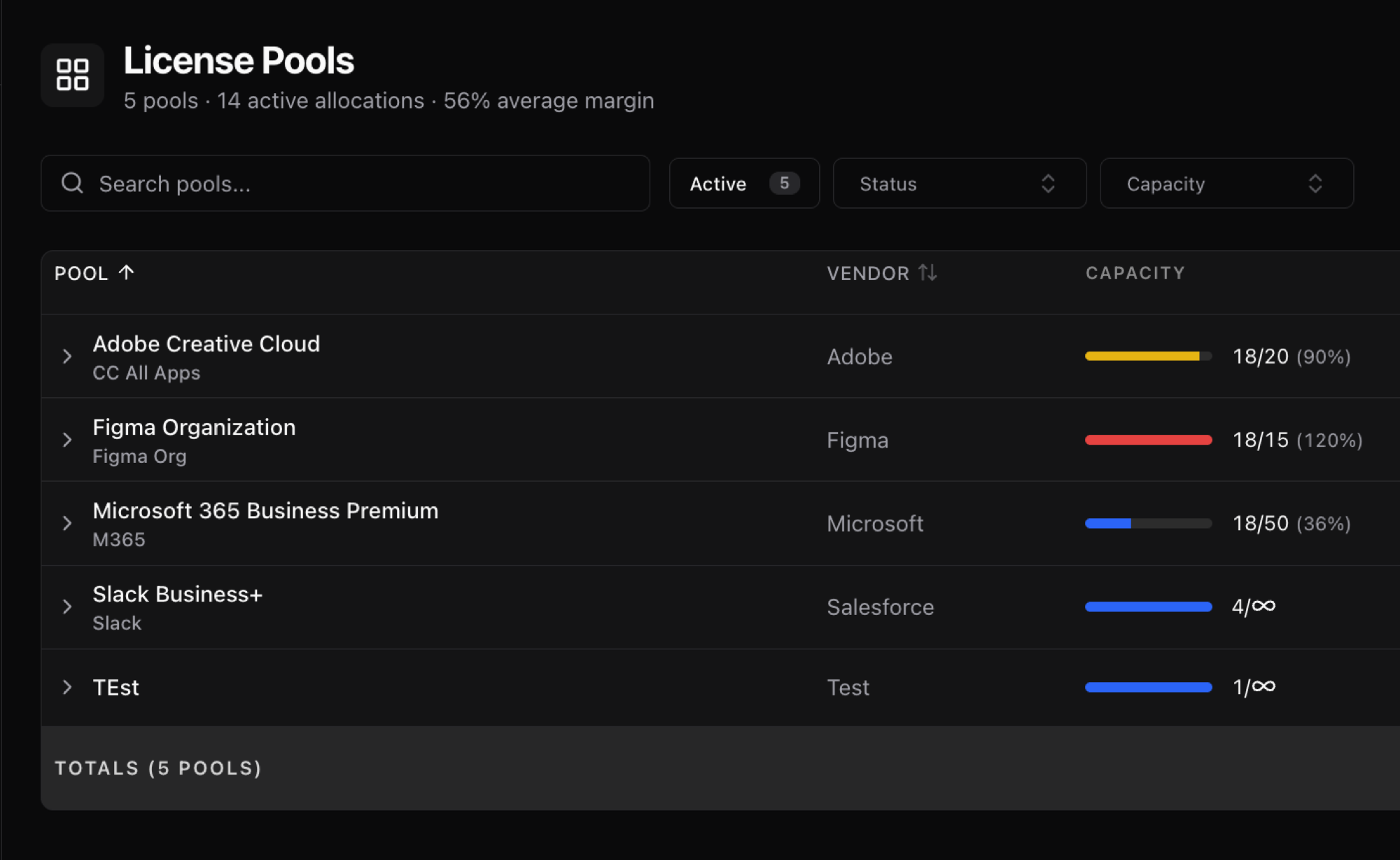 Vantage lets you create license pools with your cost and capacity, allocate to clients with their sell price, and automatically calculates margin per allocation.